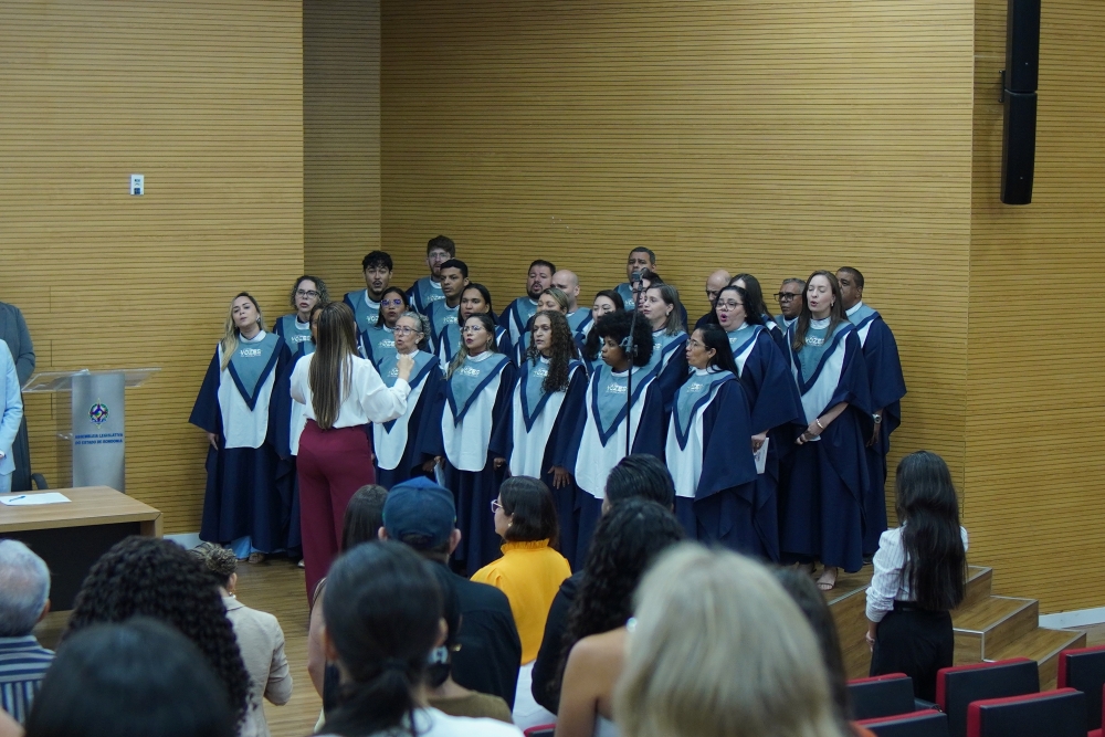 A solenidade contou com a apresentação do Coral “Vozes do Legislativo”, que interpretou duas músicas de compositores rondonienses, proporcionando um momento cultural de valorização da identidade regional.