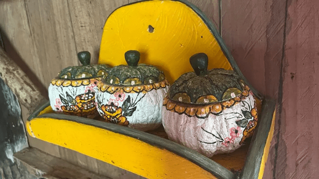 A confecção das peças é um processo totalmente manual, utilizando ferramentas simples como faca, cola, tinta e, claro, os galhos de madeira disponíveis no quintal. Os ouriços, após a extração das castanhas, também ganham uma segunda vida como kits de cozinha.