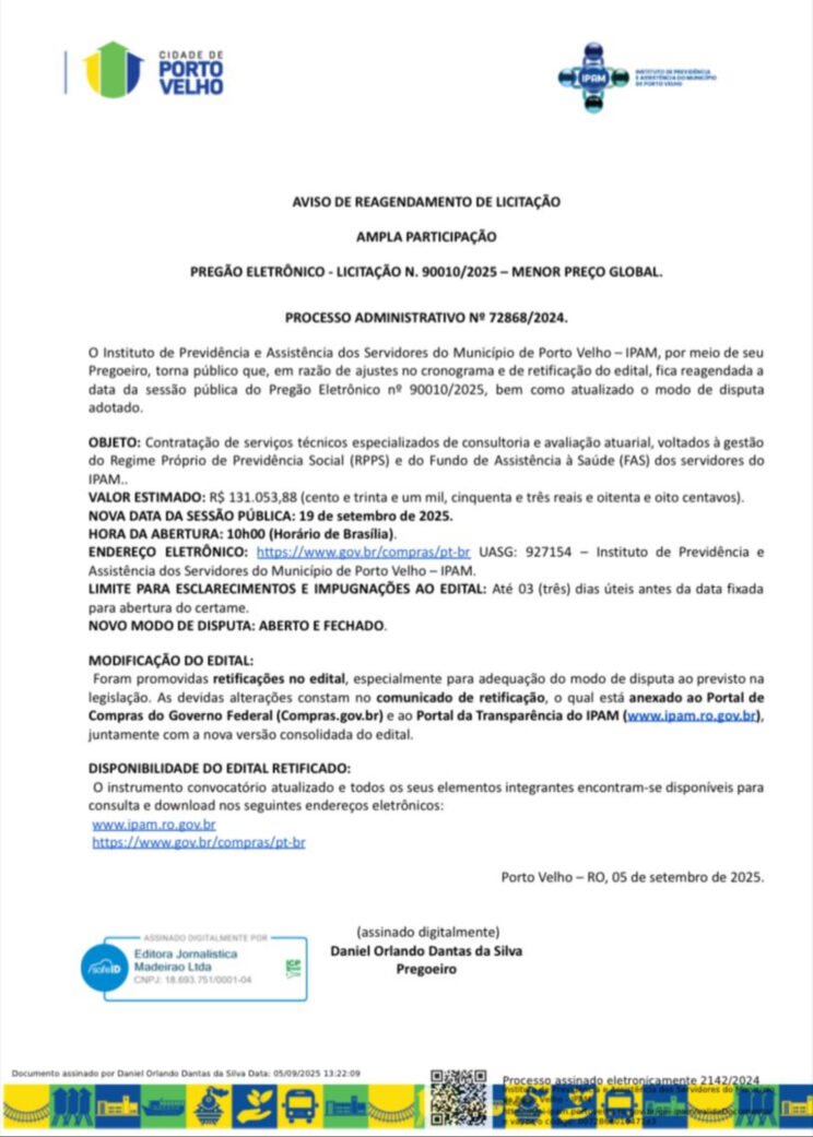 Publicação legal: Aviso de reagendamento de licitação – 90010/2025