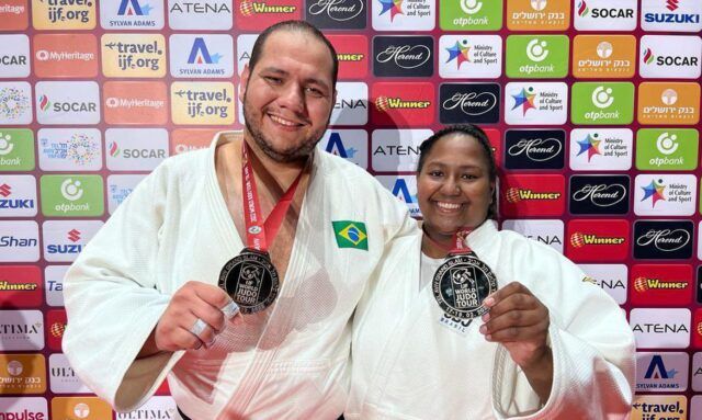 Os brasileiros Beatriz Souza (+ 78 quilos) e Rafael Silva, o Baby (+100kg) conquistaram medalhas de prata no Grand Slam de Judô de Tel Aviv (Israel) na tarde deste sábado (19). A dupla chegou invicta às finais, mas foi superada na luta pelo ouro. Bia foi superada pela francesa Romane Dicko e Baby pelo georgiano Guram Tushishvili, que já enfrentara nas quartas de final da Olimpíada de Tóquio (Japão) no ano passado.
