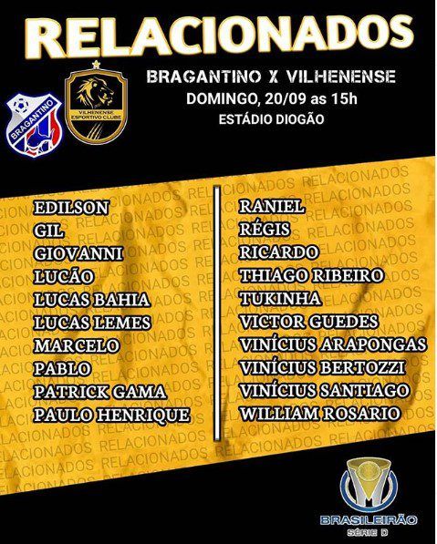 A provável formação para a partida de domingo será: Gil; Vinícius, Vinícius Bertozzi, Pablo e Thiago; Lucas, Patrick, Tuquinha e Victor Guedes; Edilsinho e Ricardo.