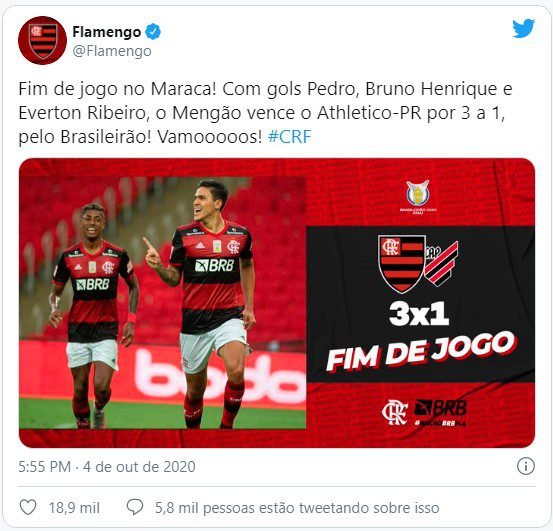 O Flamengo venceu o Athletico-PR por 3 a 1 na tarde deste domingo (4), no estádio do Maracanã pela 13ª rodada do Campeonato Brasileiro. Com este resultado, a equipe carioca chegou à quarta posição, com 21 pontos. Contudo, para permanecer no G4 até o final da rodada, terá de torcer para o Vasco não vencer o líder Atlético-MG ainda neste domingo, no Mineirão. Já o Athletico-PR, com 14, fica com apenas dois pontos de vantagem sobre a primeira equipe dentro da zona do rebaixamento, o Coritiba.