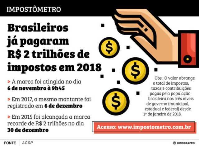 Desde 2016 a marca de R$ 2 trilhões pagos em impostos não é atingida tão cedo. Enquanto em 2018 o valor foi registrado hoje, 6 de novembro, em 2017 a marca era atingida somente um mês depois, no dia 6 de dezembro. Já em 2016, a população alcançou o valor de R$ 2 trilhões em tributos somente em 29 de dezembro, mais de 50 dias após a marca deste ano.