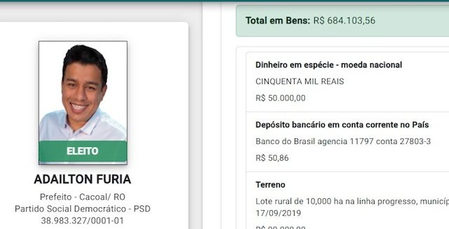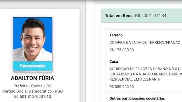 O atual prefeito de Cacoal, interior de Rondônia, Adailton Fúria (PSD), já registrou a sua candidatura junto à Justiça Eleitoral. Ele que vai tentar a reeleição declarou um patrimônio acima dos R$ 2 milhões de reais. Uma supervalorização dos bens, adquiridos de um pleito para outro (2020/2024), conforme dados do Sistema de Divulgação de Candidaturas, o DivulgaCand 2024, conferido pelo News Rondônia nesta terça-feira (13).