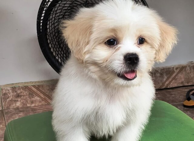 Um cachorrinho pequinês chamado Tico e a mãe dele, chamada Pipoca, de uma família do