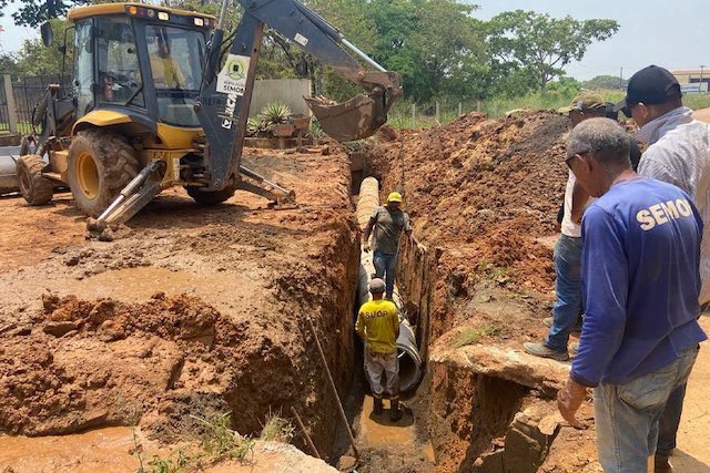Uma rede de drenagem pluvial, com 100 metros de extensão, está sendo construída na rua