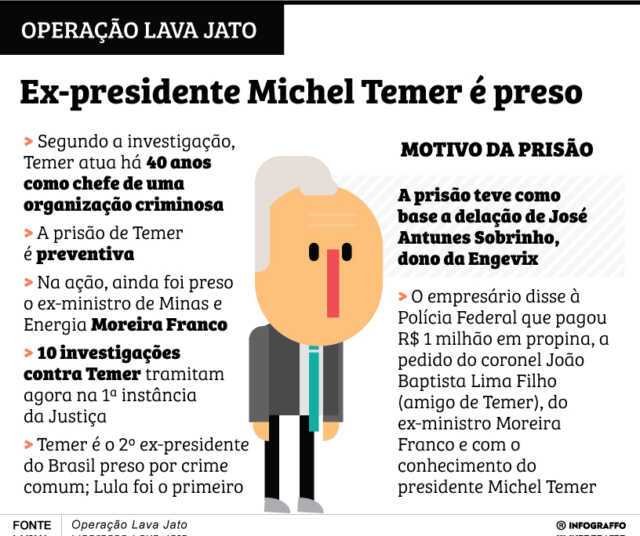 O advogado do ex-presidente, Michel Temer, Eduardo Carnelós, disse ontem, por meio de nota, que a prisão de Temer não tem fundamentos. Segundo o defensor, não existem provas de que ele teria participado do esquema de propinas nas obras da Usina Nuclear de Angra 3, conforme afirma o Ministério Público Federal.