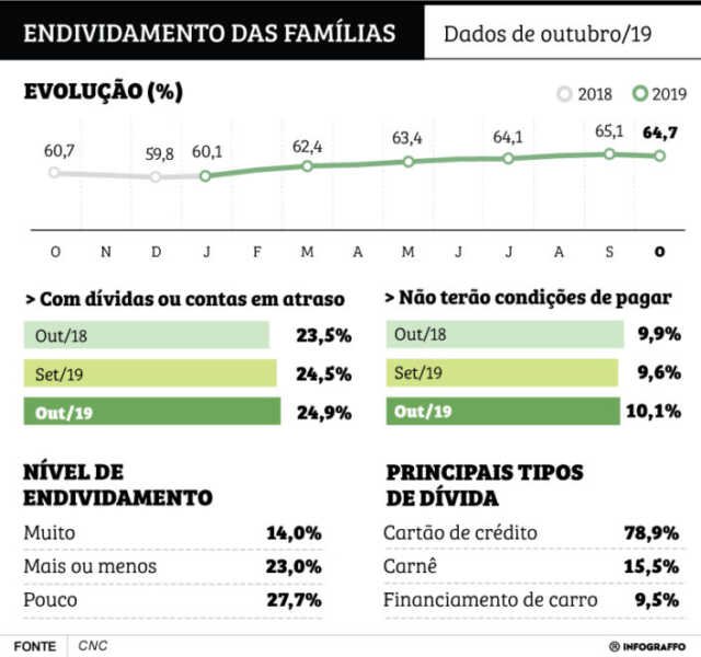 Na comparação com outubro de 2018, no entanto, o endividamento está em um patamar mais alto, já que naquela ocasião o percentual era 60,7%.