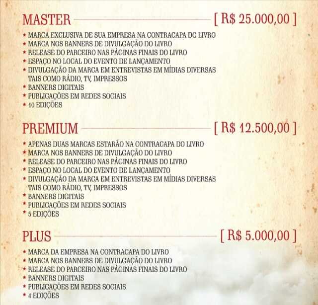 Para tanto, ele está oferecendo cotas de patrocínio: a Master, no valor de R$ 25 mil; a Premium, de R$ 12.500; e a Plus, de R$ 5.000. Abaixo, o internauta poderá ver o que cada cota oferece ao patrocinador.