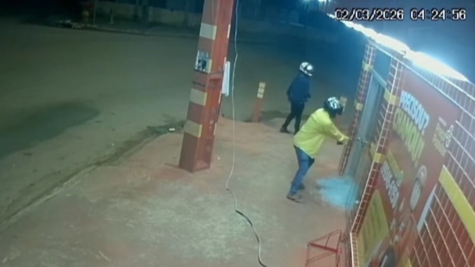 As imagens de segurança mostram que os ladrões usaram um cabo de marreta para quebrar a porta de vidro da farmácia. O caso está sendo investigado pela polícia.