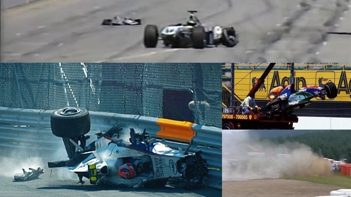 O acidente de Luciano Burti em Spa-Francorchamps aconteceu durante uma disputa de posição com Eddie Irvine. Após o toque, o piloto brasileiro perdeu a asa dianteira e seguiu sem controle até a barreira de pneus. Sem downforce, bateu a cerca de 290 km/h, o que gerou 111G de desacelaração. Burti perdeu a consciência e sofreu uma concussão, encerrando sua trajetória como titular na categoria.