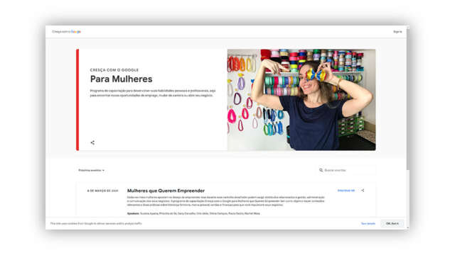O programa Cresça com o Google para Mulheres que Querem Empreender tem como objetivo apresentar conteúdos e dicas práticas sobre liderança feminina, marca pessoal, vendas e finanças. As palestras serão ministradas por Susana Ayarza, Diretora de Marketing no Google; Priscilla de Sá, Especialista em Liderança Feminina; Dany Carvalho, Networker Profissional; Cris Ueda, Consultora de Marca Pessoal; Dilma Campos, CEO da agência Outra Praia; Paula Bazzo, Planejadora Financeira; e Rachel Maia, CEO e Fundadora da RM Consulting.