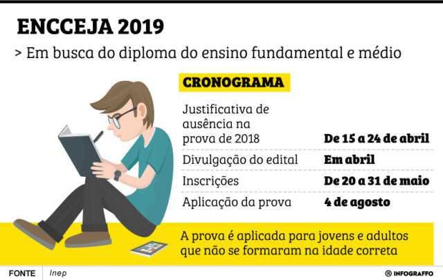 O período de inscrições vai de 20 a 31 de maio. As provas do Encceja serão aplicadas em 4 de agosto, para os Ensinos Fundamental e Médio. O Edital completo será publicado pelo Inep no mês de abril.