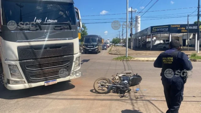 Nesta sexta-feira (31), um motociclista de aplicativo sofreu ferimentos leves após colidir com uma carreta no cruzamento das avenidas Pinheiro Machado e Guaporé, na zona Leste de Porto Velho (RO).