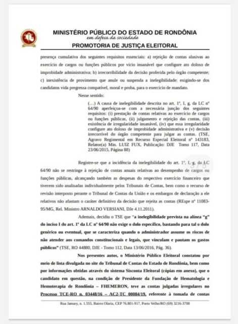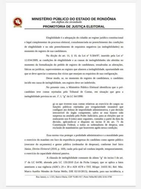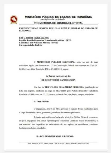 O Ministério Público Eleitoral requereu esta semana ao Tribunal Regional Eleitoral do Estado de Rondônia a impugnação do registro de candidatura de Ted Wilson (PRTB), candidato a prefeito de Porto Velho por ter suas contas como gestor reprovadas.