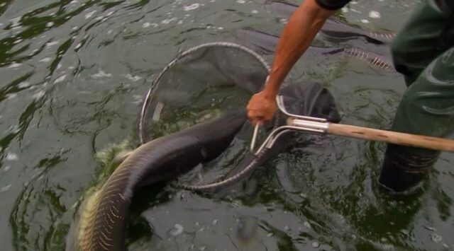 Carolina explica que o pirarucu é um predador de topo que compete por alimentos e predam os peixes nativos, causando um grande impacto no ambiente. A sugestão dos pesquisadores era liberar a pesca do peixe no trecho do rio Madeira acima da hidrelétrica, já que na parte jusante ele é nativo e a pesca é proibida.