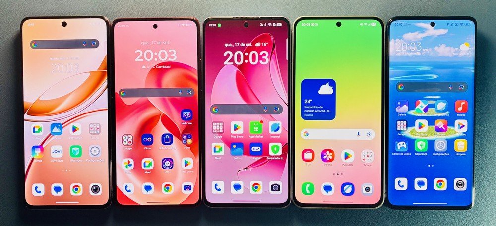 Uma análise do G1 testou cinco modelos com sistema operacional Android, avaliando design, desempenho, duração da bateria e qualidade das câmeras. Os aparelhos testados foram: