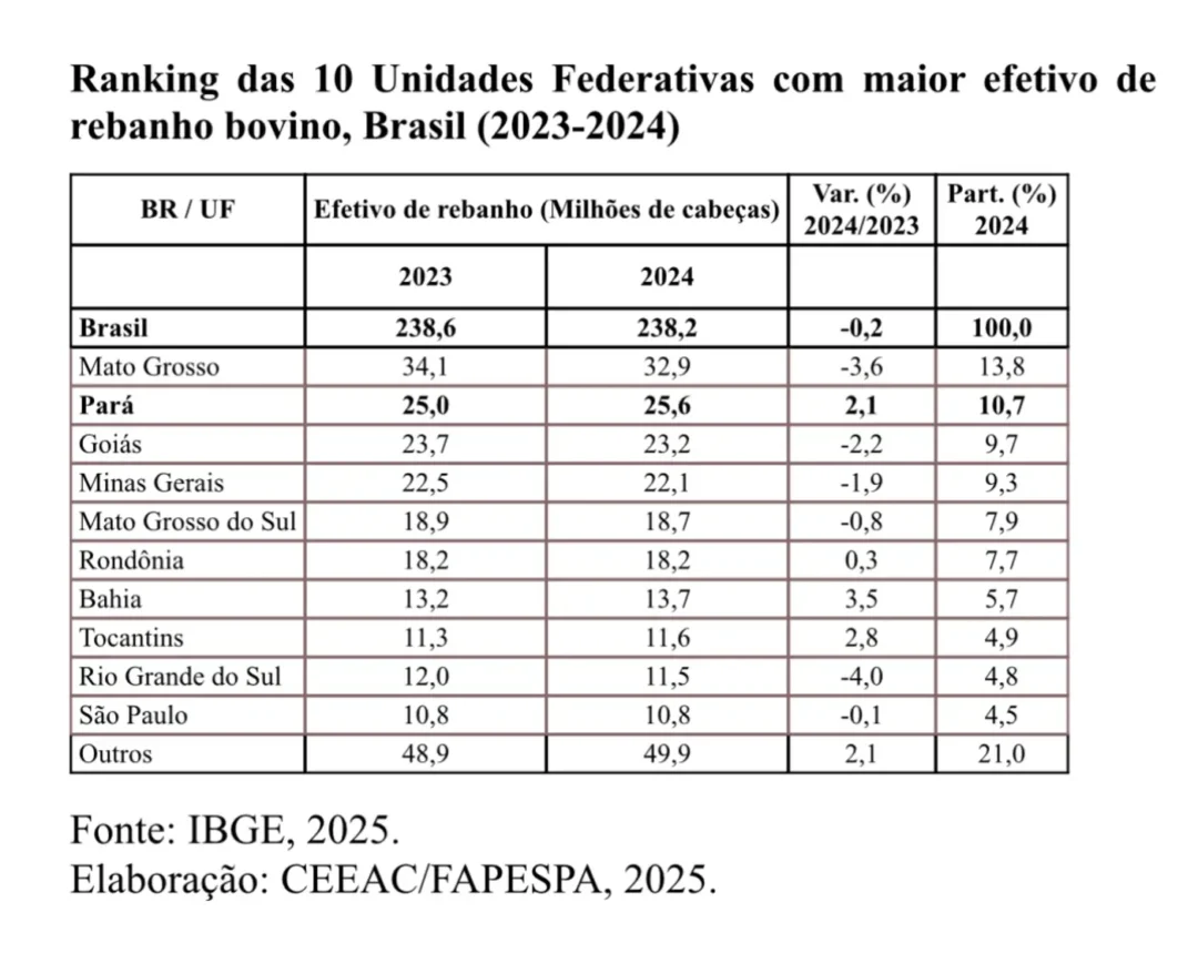 O estado é o segundo maior produtor de bovinos do Brasil, com um rebanho de 25,6 milhões de cabeças em 2024, representando 10,7% do total nacional. Apesar de um cenário de retração geral no país, o Pará registrou crescimento de 2,1%, impulsionado pela expansão da pecuária e polos produtivos.