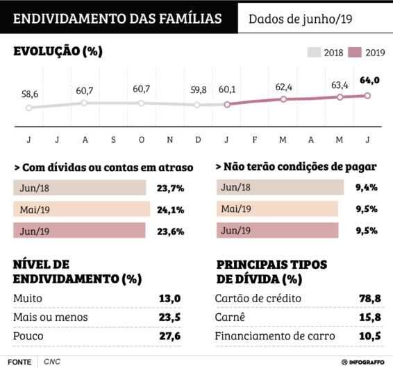 Em relação a junho de 2018, o aumento foi de 5,4 pontos percentuais. Apesar do crescimento do endividamento das famílias, que chegou a 64,0%, a Peic identificou uma queda no número de famílias com dívidas ou contas em atraso, tanto na comparação mensal quanto na anual.