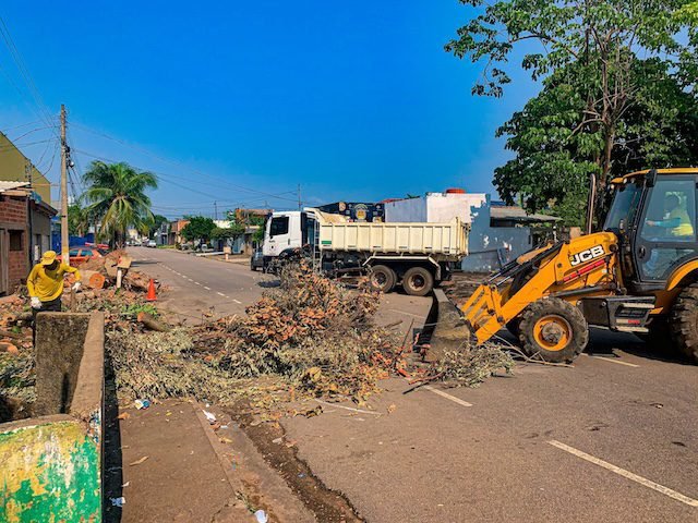 A equipe conta com apoio de caminhões e pá carregadeira, e está nos bairros Ulisses Guimarães, Ronaldo Aragão, dentre outros, realizando o recolhimento de entulhos, folhas, galhos e podas de árvores.