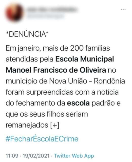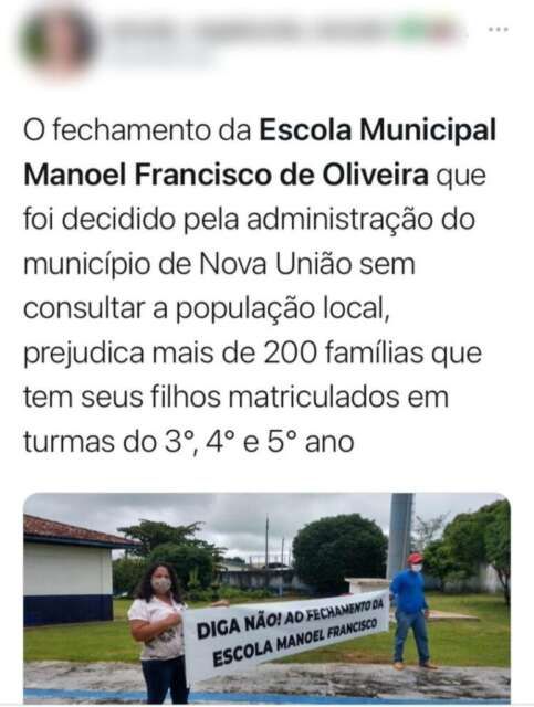 A Prefeitura de Nova União (RO), no início de janeiro, anunciou que iria retirar alunos da Escola Municipal Manoel Francisco de Oliveira e levá-los para o prédio da Escola Marcos Adriano Isller. As duas instituições ficam a poucos metros uma da outra.