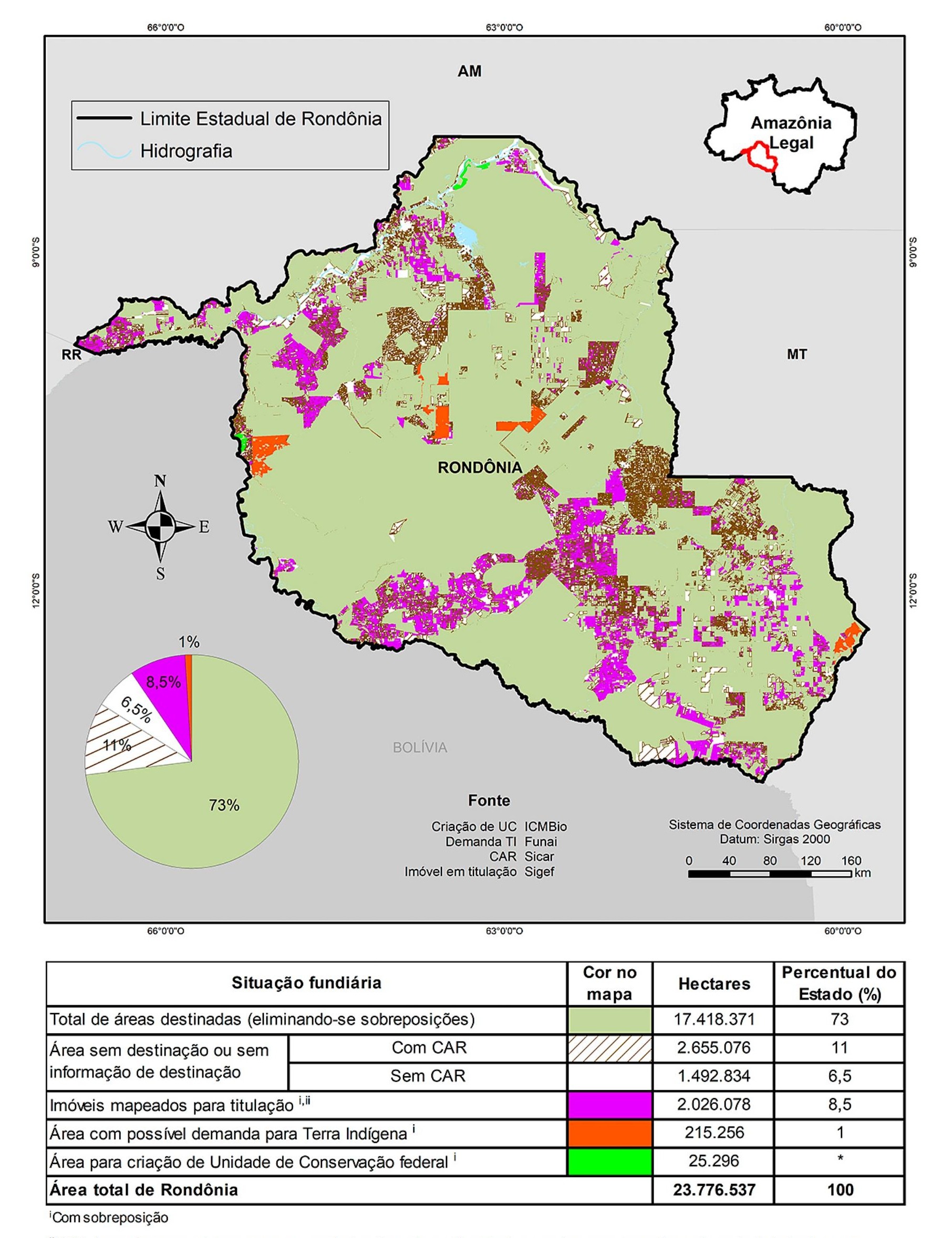 Distribuição das áreas não destinadas em processo de regularização e áreas não destinadas inscritas no Cadastro Ambiental Rural no Estado de Rondônia