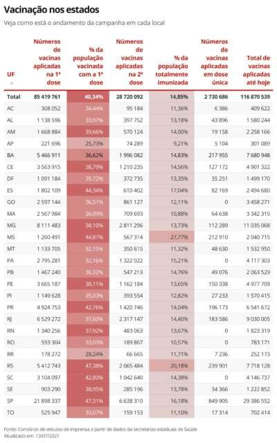 Já a 2ª dose foi aplicada em 189.867 moradores, cerca de 10,57%. Os dados são do Consórcio de veículos de imprensa e foram publicados na noite de terça-feira (13).