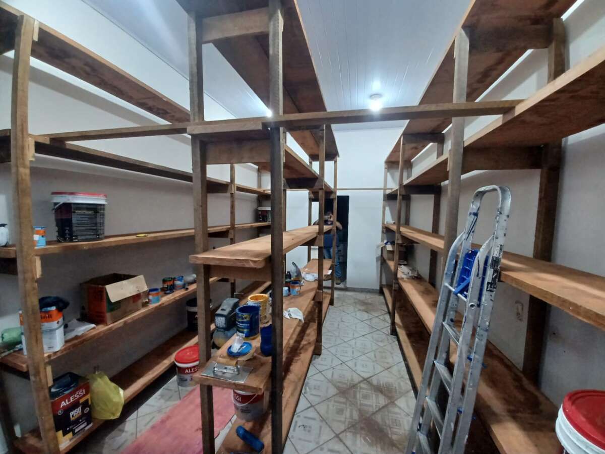 A adaptação contempla a divisão do ambiente em duas áreas distintas: uma sala frontal destinada à recepção e atividades administrativas, e dois espaços maiores voltados ao armazenamento de materiais. Entre as melhorias realizadas estão pintura completa, substituição de forro danificado, troca de fechadura em uma das portas, instalação de outra porta com fechadura e construção de prateleiras.