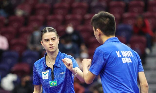 O Brasil subiu ao pódio duas vezes nesta segunda-feira (15) no Pan-Americano de Lima (Peru). Nas duplas mistas, Bruna Takahashi e Vitor Ishy conquistaram o ouro, a primeira medalha do país na competição. Depois Ishy também faturou o bronze, ao lado de Erick Jouti, na disputa de parcerias masculinas.