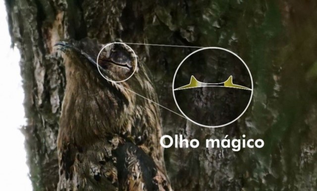 Conhecido como “olho mágico”, os olhos do urutau são grandes e redondos, com a íris amarela. A cor chamativa não colabora para a camuflagem perfeita da ave, por isso os indivíduos fecham os olhos quando a ameaça se aproxima. No entanto, a visão não é interferida, pois a pálpebra superior possui duas fendas que permitem ao urutau enxergar, mesmo com os olhos fechados.