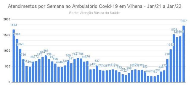 Em janeiro o Ambulatório Covid-19 completa um ano de atividade em Vilhena, concentrando todos os atendimentos de pacientes com sintomas gripais. Desde 11 de janeiro do ano passado até 10 de janeiro deste ano foram realizados 31.304 atendimentos no local, dos quais 10.699 foram confirmados como covid-19. O surto desde o fim de dezembro resultou em um aumento impressionante na quantidade de pacientes, representando, apenas nos últimos 60 dias, mais de ¼ do total de atendimentos.